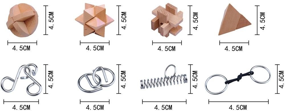 Ensemble de 8 puzzles d’experts. Pour les personnes expérimentées dans la résolution de puzzles, cet ensemble est un excellent moyen de répondre à la question « Que vais-je faire de mon temps lorsque je serai à la retraite ? » Il y a 4 puzzles en bois et 4 en métal. Ils sont livrés dans une boîte afin que vous puissiez les garder tous bien rangés.